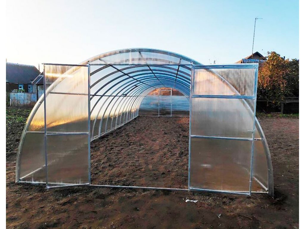 Odolná konstrukce - Oblouky jsou hlavním nosným prvkem skleníku. Pro maximální tuhost je čelní plocha plně svařena a ohyby jsou plně ohnuté bez uzlů. Pro skleníky série Afrodyta o šířce 3 metry se vyrábějí speciální oblouky z hrubého ocelového profilu o průřezu 40x20 mm, s profilem zahnutým "na okraj". Počet oblouků ve skleníku je zvýšen (vzdálenost mezi oblouky je 67 cm) a zajišťuje rovnoměrnější sněhové zatížení buněčného polykarbonátu, což znamená, že konstrukce pokrytá polykarbonátem je perfektní i pro zasněženou polskou zimu.