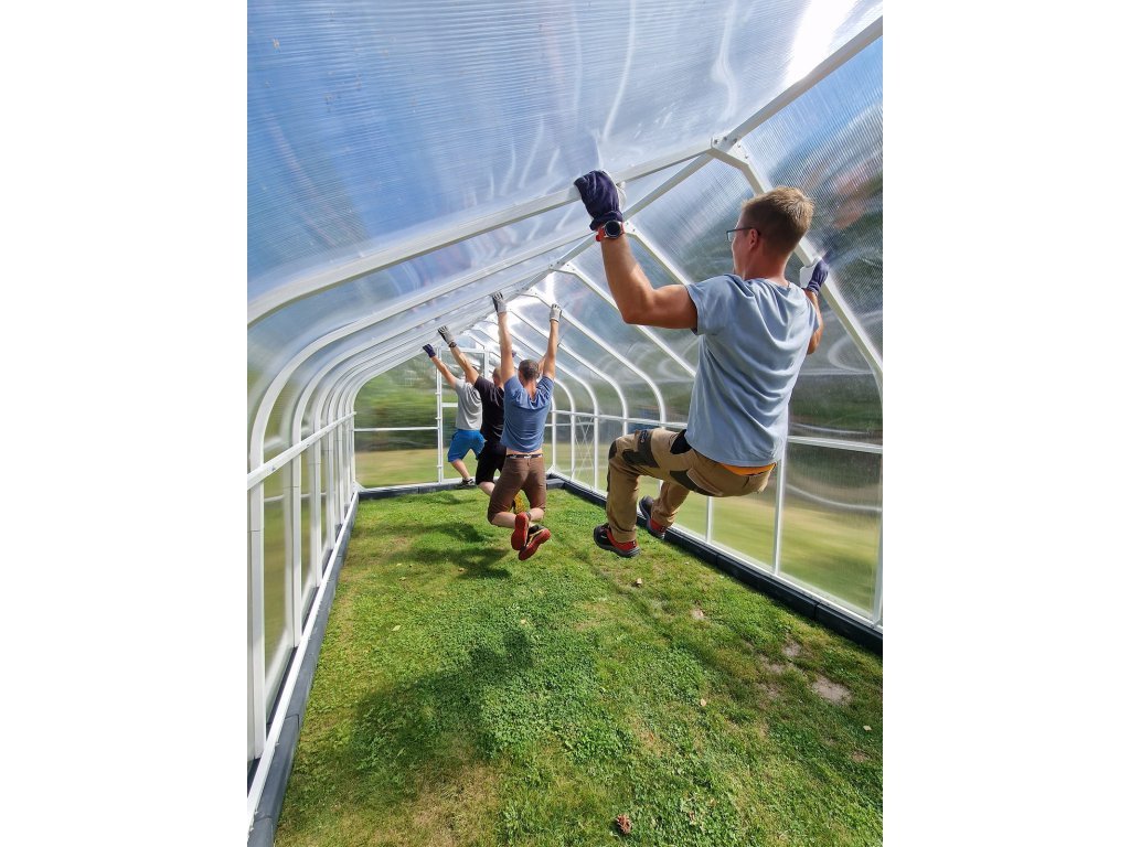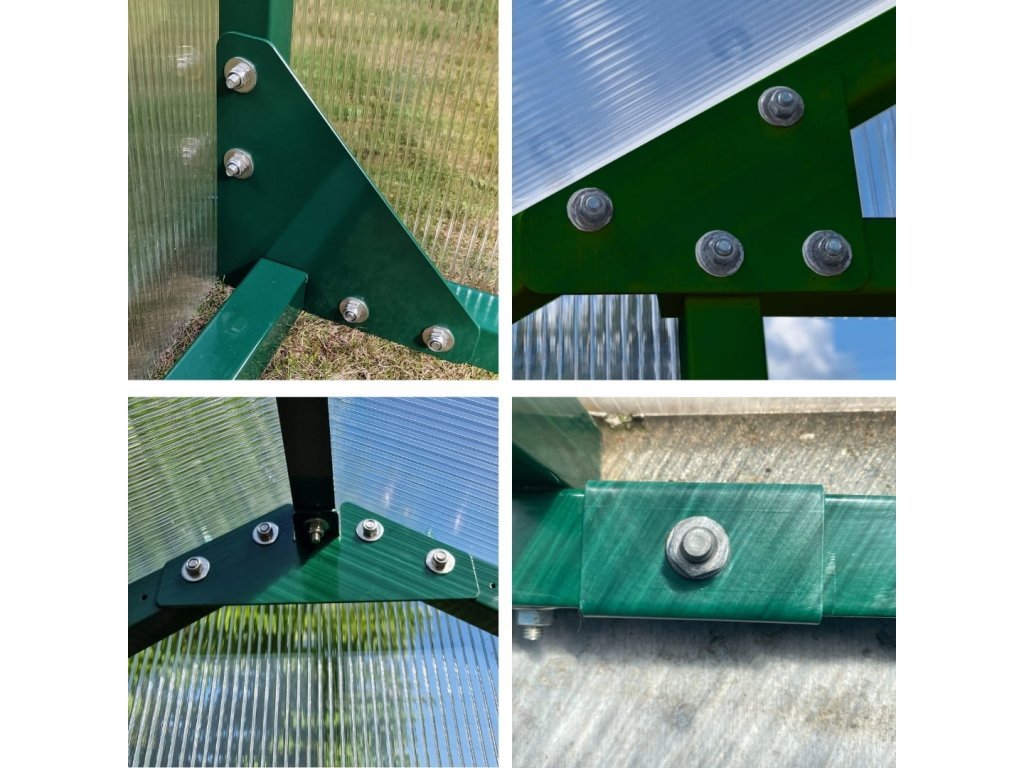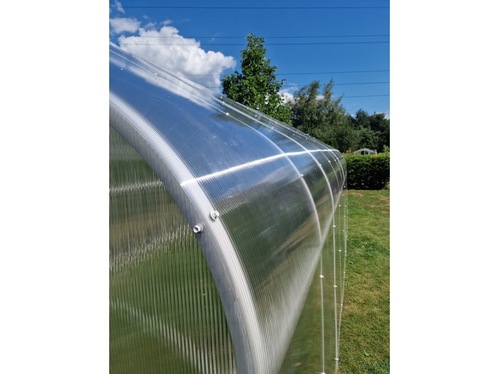 - všechny polykarbonátové panely jsou řezané a ohnuté na velikost skleníku, není třeba řezat/seřizovat prvky během montáže;